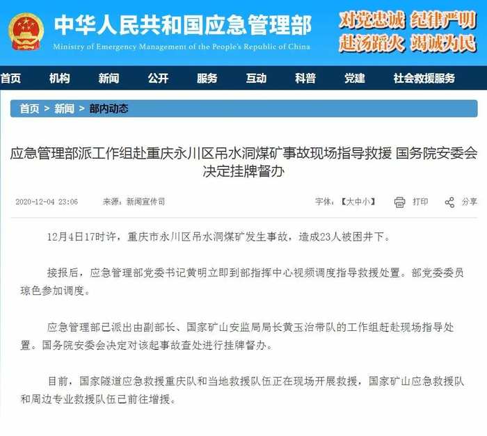 重庆煤矿事故23人被困井下,应急管理部工作组赴现场指导救援。