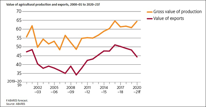 澳大利亚农业与水资源部下属的农业资源经济局(ABARES)在12月的季度报告中预测,2020年至2021年,澳大利亚农产品出口将下降7%,至447亿澳元(约合2170亿人民币),为5年来最低水平。