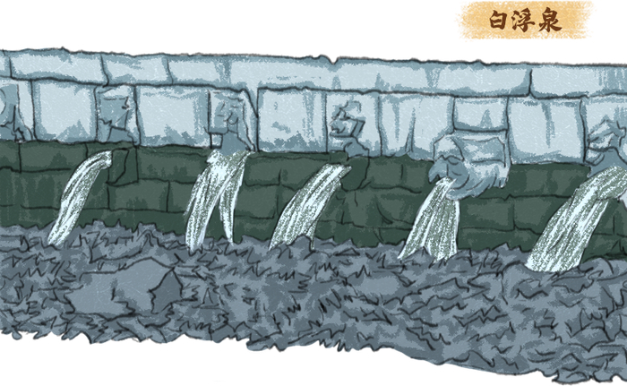 白浮泉名龙泉,当年建有水池,池壁用花岗岩砌成,九个龙头用汉白玉雕刻,嵌入石壁。泉水自龙口喷出,有“九龙戏水”“九龙喷玉”之说。