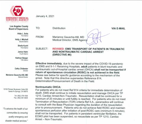 洛杉矶实施护理配给制度 救护车拒收生存率过低患者