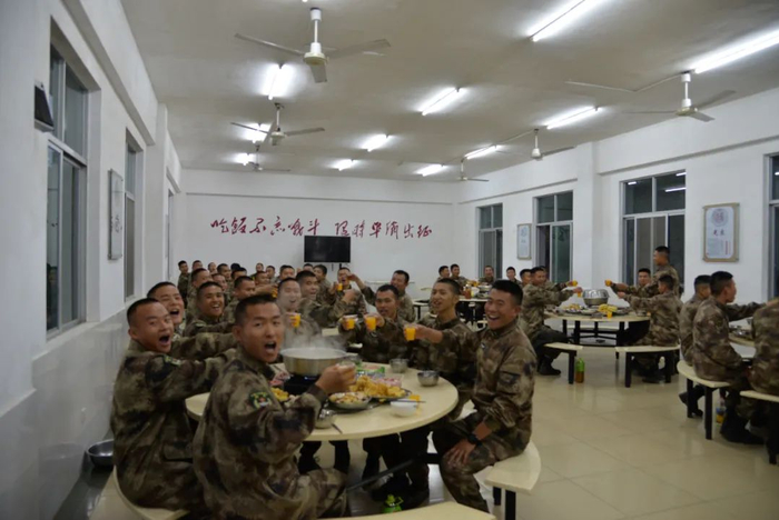 丰盛的晚餐是迎接新战友必不可少的,红红火火的加餐火锅赶走了寒风,带来了春天般的温暖。