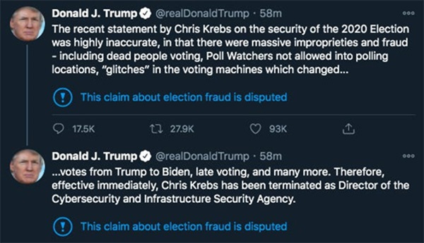 特朗普2020年11月17日发布推文称:“克里斯·克雷布斯最近发布的关于2020年大选的声明极不准确,因为其中存在大量不当行为和欺诈,包括‘过世者’投票、选举观察人士不被允许进入投票地点、‘故障’的投票机将特朗普的选票改为拜登的选票、延迟投票等更多问题。因此,网络安全与基础设施安全局局长克里斯·克雷布斯被解除职务,该命令立即生效。”