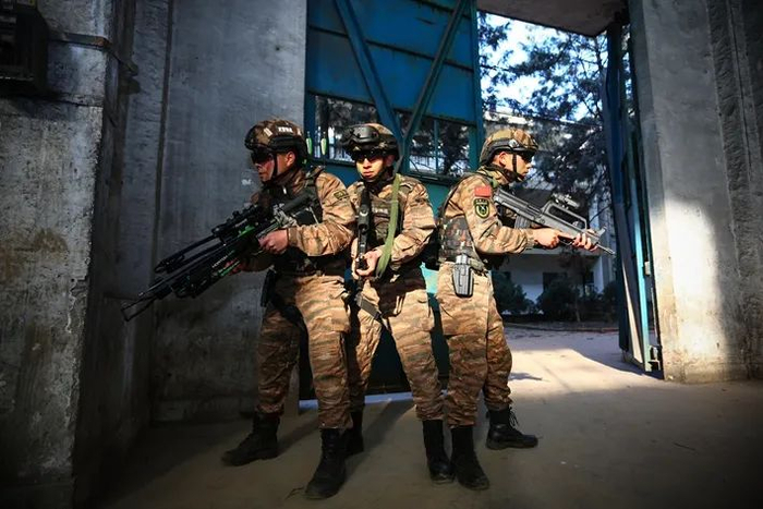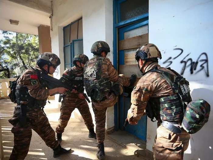近日,武警云南总队某机动支队特战中队10余名特战队员全副武装,开展楼房反劫持实战演练,不断锤炼特战队员遂行多样化任务能力。