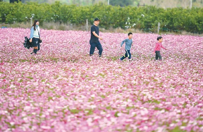 日前,海南省琼海市龙寿洋万亩田野公园花海各色花卉美丽绽放,吸引四面八方游客前来“打卡”。袁 琛摄(人民视觉)