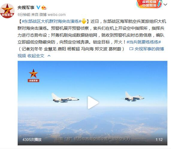 【#东部战区大机群对海突击演练#】近日,东部战区海军航空兵某旅组织大机群对海突击演练。预警机展开预警侦察,官兵们在机上开设空中指挥所,指挥兵力进行态势布设;歼轰机刚完成数据链组网,就收到预警机实时态势信息,编队立即超低空隐蔽突防,向预定空域奔袭。锁定目标,开火!#当兵就要练练练#(记者刘冬冬 金慧龙 唐阳 杨智超 冯向海 郑文波 葛树蔚)