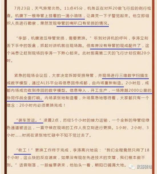 据航空工业成飞官方微信近期报道,在2019年国庆70周年大阅兵期间的保障过程中,保障人员发现了歼-20机腹液压导管轻微受损,而外场又缺少备件,是更换还是不更换?要更换的话,离第二天飞行计划只有20个小时,还要内场现生产部件运到外场,来得及吗?