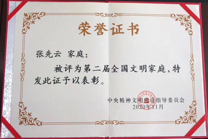 2020年底,当张先云得知被评为“全国文明家庭”时,笑着对邓永东说:“以前,你总说你的的军功章有我一半,那今天我的荣誉也有你的一半,感谢老公……”