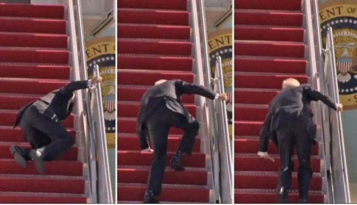 3月19日,在安德鲁斯联合基地,拜登在试图登上“空军一号”的舷梯时连摔了三次,令人惊讶。