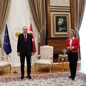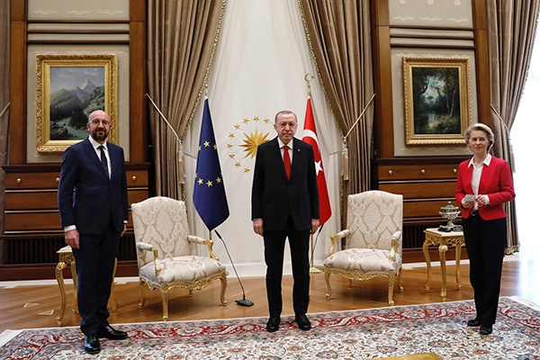 欧洲理事会主席米歇尔和欧盟委员会主席冯德莱恩6日到访土耳其首都安卡拉,与土总统埃尔多安会面。然而会议大厅只有两张椅子,冯德莱恩“被迫”坐在一旁的沙发上。这一尴尬场面让土耳其和欧盟双方近日陷入口水战,双方互相指责对方准备不当。
