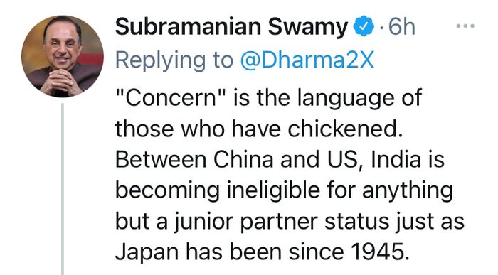 值得一提的是,印度人民党议员斯瓦米也对此发表了评论,认为胆怯的人才会用“关切”这种语言。↓