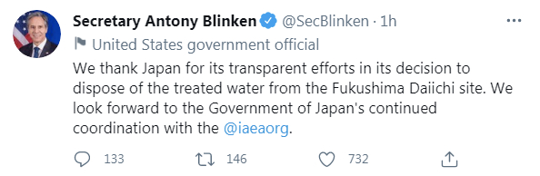 日本政府13日召开内阁会议正式决定,福岛第一核电站核废水经过滤并稀释后将排入大海。对此,美国国务卿布林肯刚刚在推特上发文说:“我们感谢日方在决定处理福岛第一核电站处理水问题上所做出的显而易见的努力。我们期待日本政府继续与国际原子能机构进行协调。”