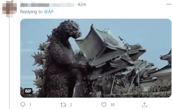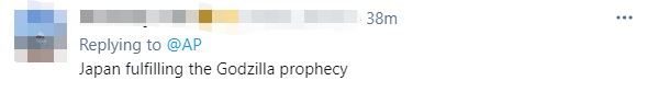 有网友联系到日本动漫怪兽形象“哥斯拉摧毁地球”的画面,讽刺说,“日本正在实现哥斯拉预言”。↓