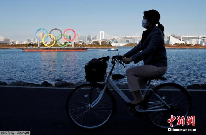 当地时间2020年12月1日,日本东京,正在用船运输的奥运五环标志,时隔4个月的安全检查和维修后,它重新回到东京湾上。