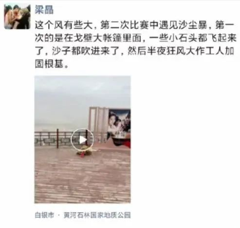 梁晶最后一条朋友圈发布于5月22日8点20分,他写道:“这个风有些大,第二次比赛中遇见沙尘暴,第一次的是在戈壁大帐篷里面,一些小石头都飞起来了,沙子都吹进来了,然后半夜狂风大作工人加固根基。”