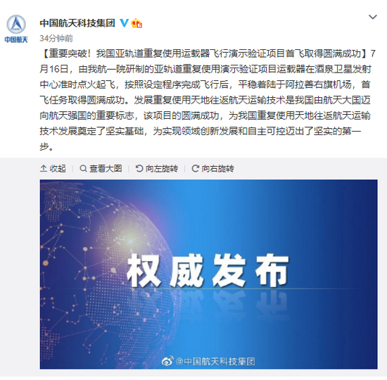 2021年7月16日,由中国航天科技集团一院研制的亚轨道重复使用演示验证项目运载器在酒泉卫星发射中心准时点火起飞,按照设定程序完成飞行后,平稳水平着陆于阿拉善右旗机场,首飞任务取得圆满成功。