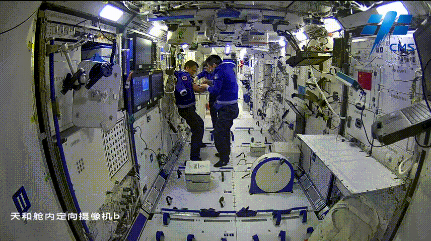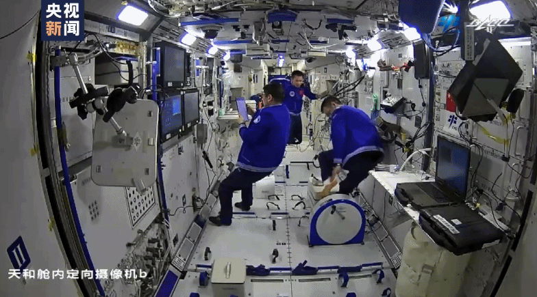 除了开展各项实验,整理内务也不能停。还记得他们刚进驻天和核心舱时,舱内堆满了大大小小的包裹,现在舱内环境已变得干净整洁、秩序井然。收纳的秘诀,就是在地板上设置储物空间,那些暂时用不到的包裹,就会被收纳进空间站的夹层之中,使“太空家园”更加温馨舒适。