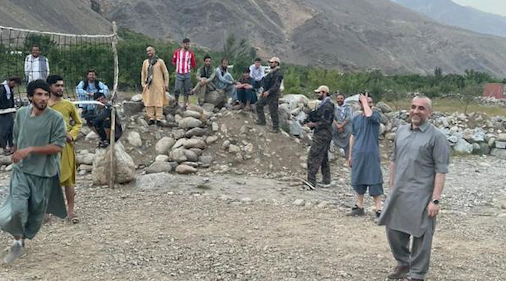 阿富汗副总统与手下打排球:条件简陋 木棍架起球网 士兵扛枪站岗