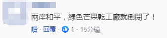 针对李丽珍的论调,有岛内网友直言,“两岸和平,绿色芒果干(‘亡果感’的谐音)工厂就倒闭了!”