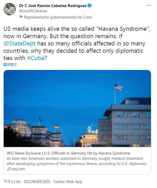 上月,当在德国工作的美国官员也出现“哈瓦那综合征”时,曾任古巴驻美国利益代表处负责人的外交官卡巴纳斯发推称,“美媒始终炒作所谓‘哈瓦那综合征’,现在是在德国出现了。可问题是,如果美国国务院那么多官员在那么多国家都感染了这种病,为什么这只影响了跟古巴的关系?”