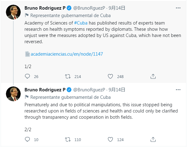 罗德里格斯指责美国借卫生与科学之名对古巴实施不公正的政治操弄,他说,“由于政治操纵,这一问题过早地停止了在科学和卫生领域的调查,而问题只能通过这两个领域的透明度和合作来澄清。”