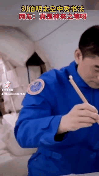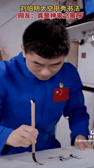 他挽起袖子,轻轻拿起漂浮在太空中的毛笔。