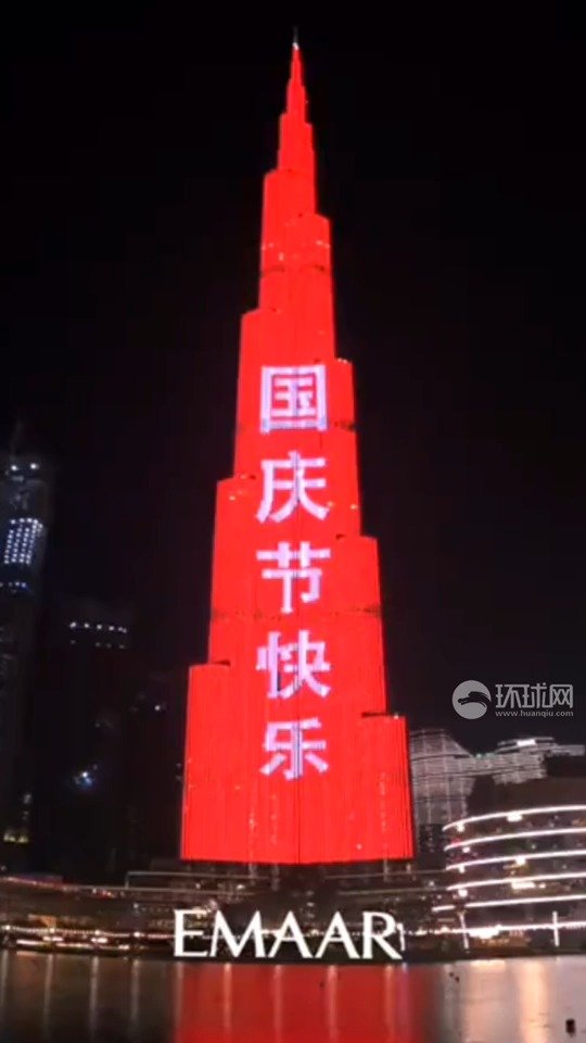 世界第一高楼哈利法塔点亮中国红 中文打出“国庆节快乐”