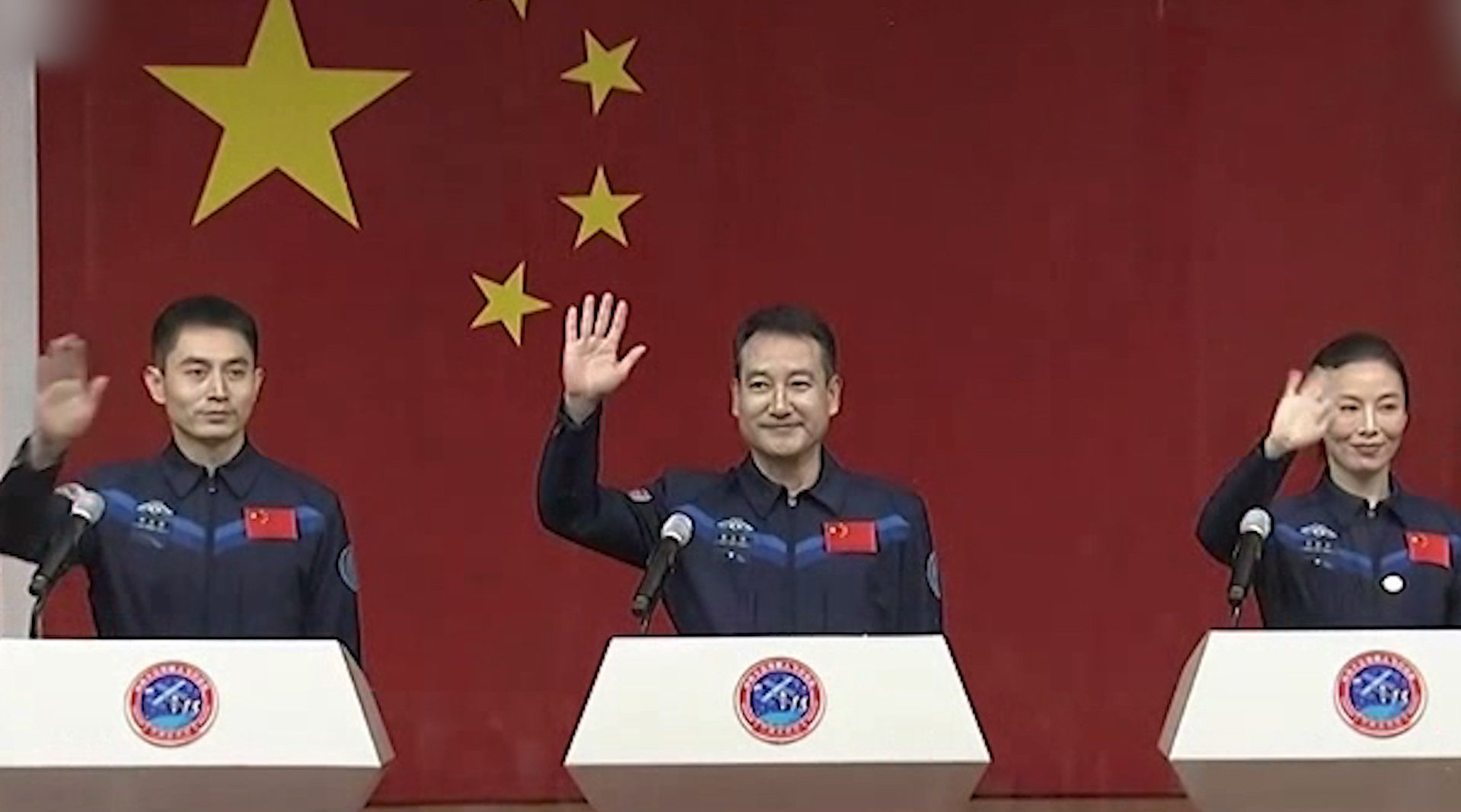 现场!神舟十三号三名航天员亮相见面会,向大家挥手致意