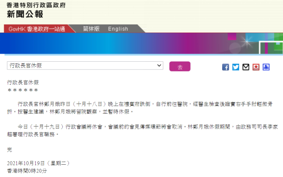 港府深夜通报:林郑月娥跌伤暂时休假