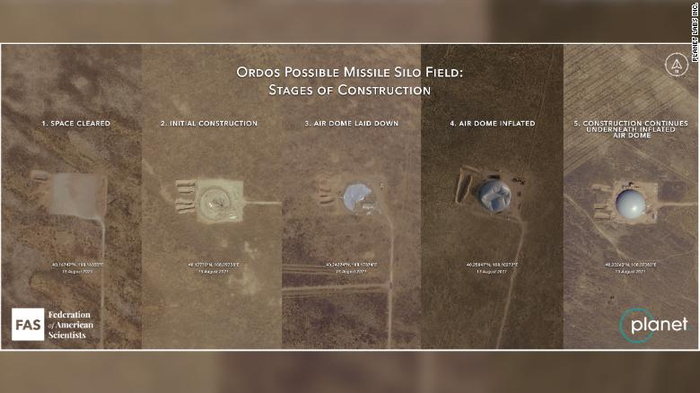 美国有线电视新闻网的报道称,“美国科学家联合会”的专家通过对美国商业遥感卫星影像公司 Maxar和 “星球实验室”提供的商业卫星图像进行分析,发现“中国在内蒙古鄂尔多斯地区新建的多个导弹发射井已陆续进入不同的施工阶段”,其中有三口导弹发射井建设“神速”,已经“使用圆形的充气保护罩以保护发射井上建筑”,“美国科学家联合会”在报告中称,在上世纪70年代和80年代,中国就曾混合使用“大矩形罩”、“伪装网”和其他类型的遮蔽装置来保护导弹发射井免受恶劣天气的影响和间谍卫星的侵扰。