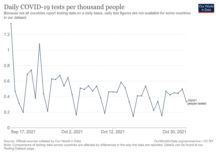 牛津大学“以数据看世界(Our World in Data)”项目的数据统计显示,从9月初起,日本的日均检测数量便开始下降,随之每日新增确诊的人数也开始下降。自9月25日起,日本全境的每千人检测数量已不足千分之一。