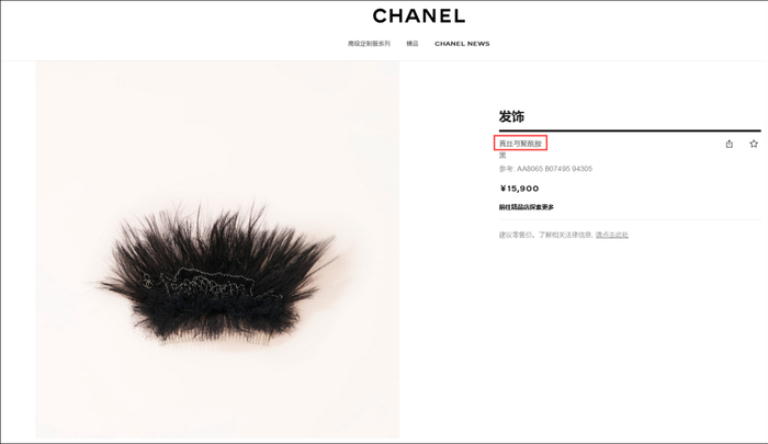如此一来,再看看香奈儿另一款售价更高的相似发饰,与15900元标价同一列的,是相对质朴的描述“真丝与聚酰胺”。虽然再白话一点地说,它其实是可以叫做“真丝与尼龙”。