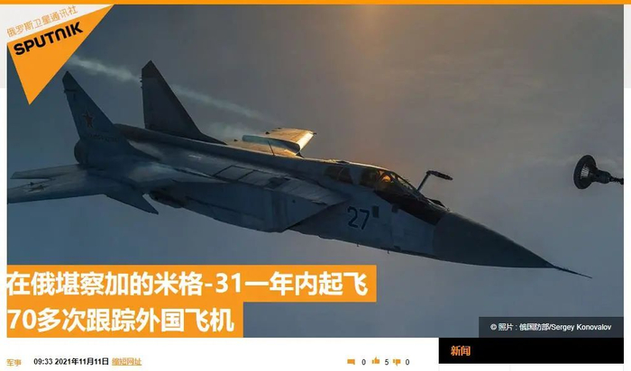 俄军方的消息称,2021年,俄东北部军队混成航空团值班部队编成中的米格-31BM歼击机升空70多次跟踪外国飞机。俄罗斯东部军区太平洋舰队新闻处称,其中,在楚科奇乌戈利内耶科皮机场值班的米格-31BM歼击机在白令海和楚科奇海地区10多次升空跟踪外国飞机。