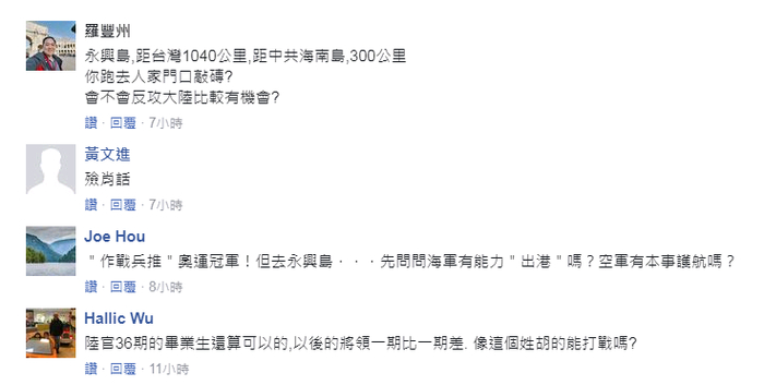 台湾《中国时报》7日称,胡镇埔6日参加台媒节目时,针对外界担心解放军是否会发动针对太平岛的“夺岛计划”,他宣称“如果共军不顾一切要去夺太平岛,目前岛上也有防卫性武器,官兵平时也都针对各种可能状况进行演练,我想(夺岛)不是那么容易”。