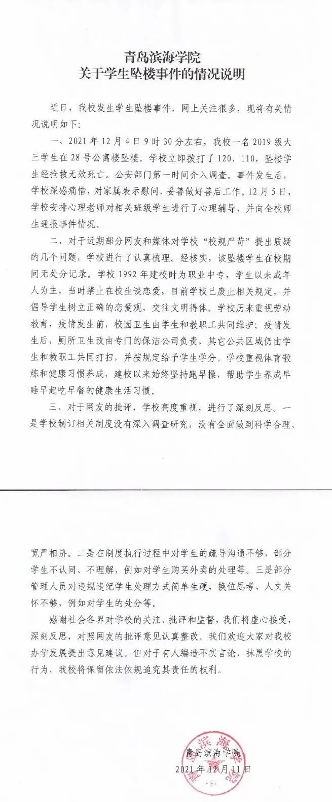 12月12日凌晨,青岛滨海学院通报:12月4日,该校一名2019级大三学生坠楼,经抢救无效死亡。