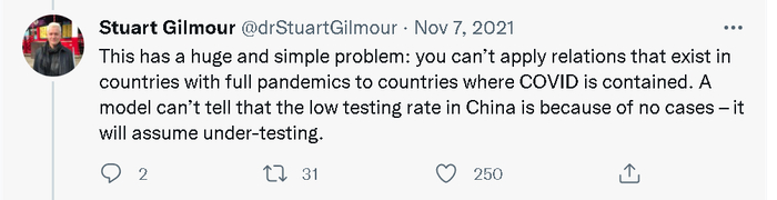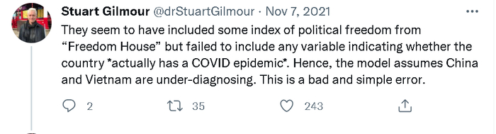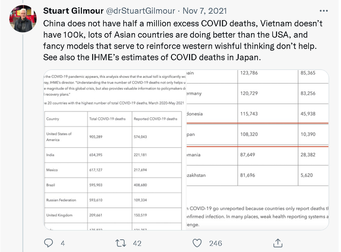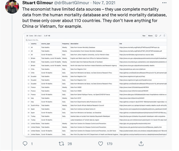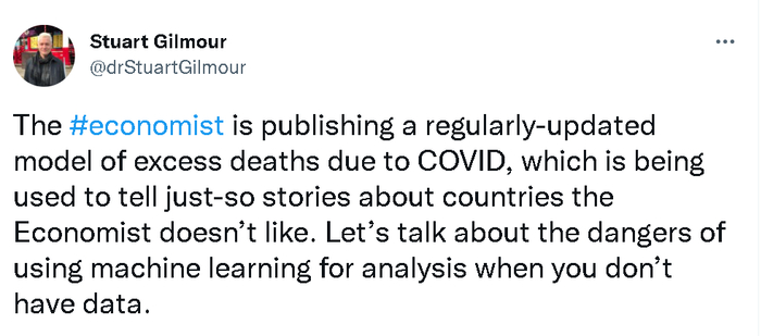 其中,日本圣路加国际大学(St. Luke's International University, Japan)的生物统计学教授Stuart Gilmour就连发了20多个贴文,详细指出了《经济学人》这个新冠疫情“实际死亡人数”的大数据模型和人工智能推算系统在推算中国和越南等采取严格防疫措施的亚洲国家时存在的严重误差以及这种误差的由来。