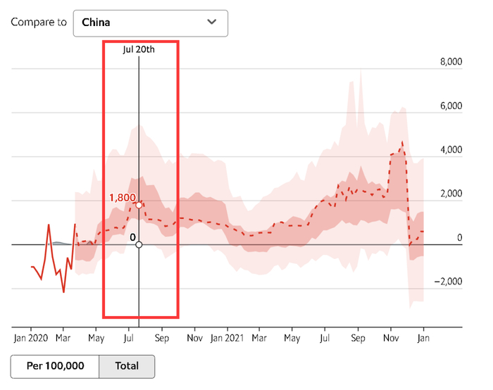 这便是为何,在比如2020年7月20日这天,虽然当时中国的疫情早已得到有效控制,当天只是新增了11个确诊病例(8例本土,3例境外输入)和6例无症状感染者,且无人死于新冠,可《经济学人》的大数据模型和人工智能系统却离奇地“推算”出了中国在当天因疫情死了1800人。