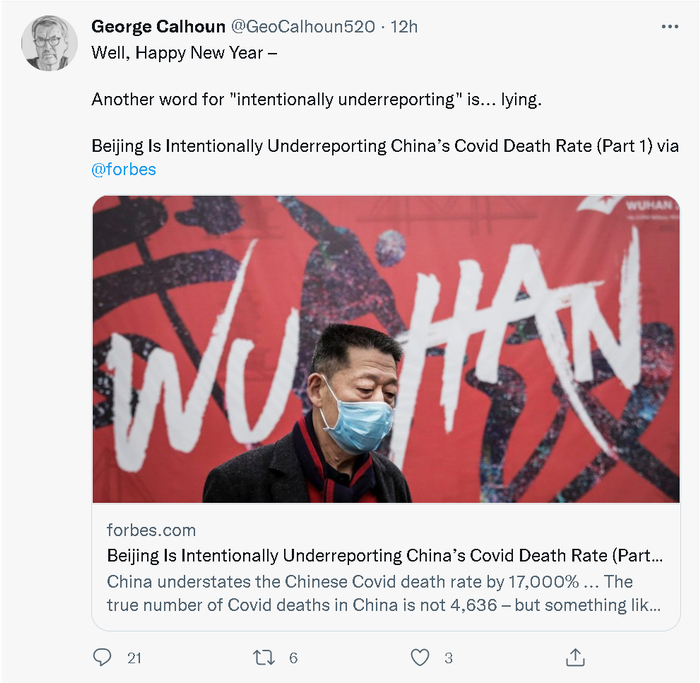 不过,这位教授却于2022年1月2日在美国新闻资讯网站福布斯上撰写了一篇“分析”中国新冠疫情死亡人数的文章,并抛出了一个让全世界看来都觉得荒诞的说法:中国的新冠疫情“实际死亡人数”不仅多于美国,更达到了170万人。