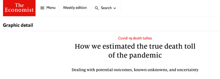 随后,他抛出了他最核心的“论据”,称英国《经济学人》杂志(The Economist)通过大数据模型和人工智能验算,发现全世界都“少报”了新冠疫情的实际死亡人数,其中中国少报的死亡病例数,经《经济学人》用大数据模型和人工智能推算,为170万。