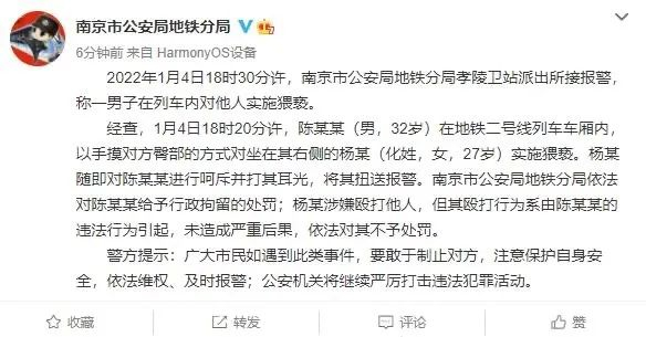 经查,1月4日18时20分许,陈某某(男,32岁)在地铁二号线列车车厢内,以手摸对方臀部的方式对坐在其右侧的杨某(化姓,女,27岁)实施猥亵。杨某随即对陈某某进行呵斥并打其耳光,并将其扭送报警。南京市公安局地铁分局依法对陈某某给予行政拘留的处罚;杨某涉嫌殴打他人,但其殴打行为系由陈某某的违法行为引起,未造成严重后果,依法对其不予处罚。