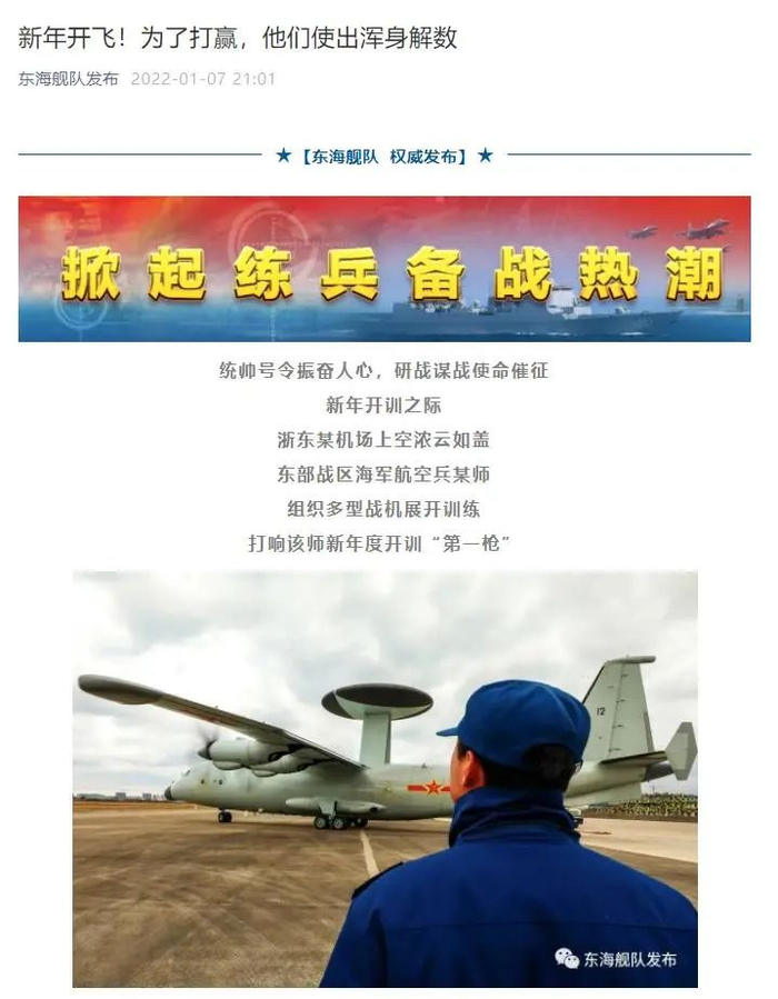 根据解放军东海舰队官方微信公众号“东海舰队发布”7日的消息,新年开训之际,东部战区海军航空兵某师组织多型战机展开训练。根据报道,出动的军机至少包括预警机与反潜巡逻机。据该师领导介绍,新年度他们将围绕体系对抗加强针对性研究,不断深化战训耦合、提高体系作战能力。