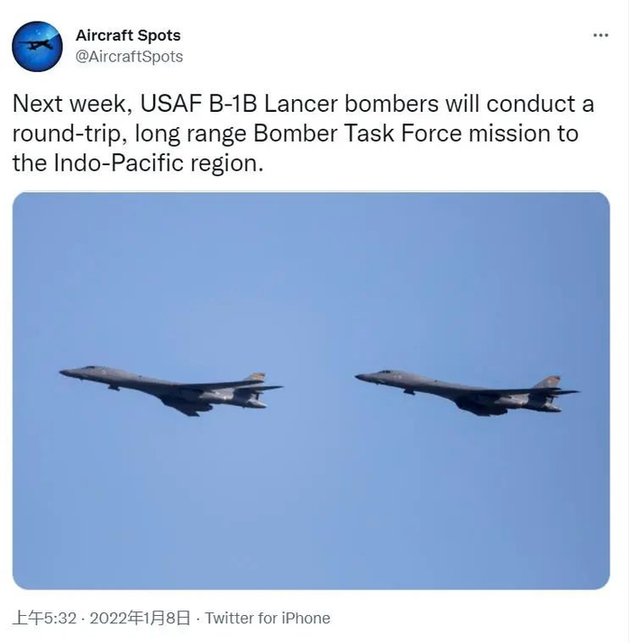 虽然中国周边海空域近来似乎比较消停,并没有太多美军舰机的动静,但这可能只是因为他们正在延续圣诞假期。2022我们一定不能掉以轻心。“飞机守望”推特账号8日发布消息称,下周,美国空军的B-1B轰炸机将前往印太地区执行一次远程轰炸机特遣部队任务。