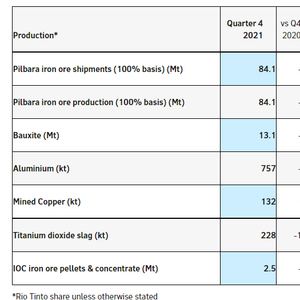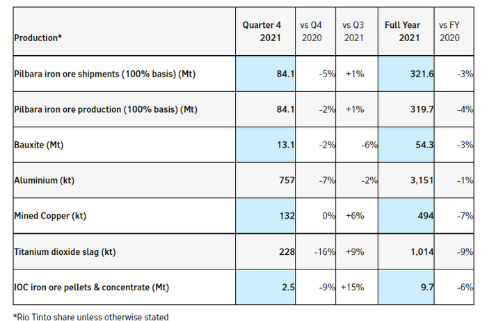 《澳大利亚人报》18日报道称,力拓报告显示,2021年力拓集团的铁矿石产量下降4%,至3.197亿吨;出货量下降3%,至3.216亿吨,实际上没有完成下调后的3.25亿吨年度目标。