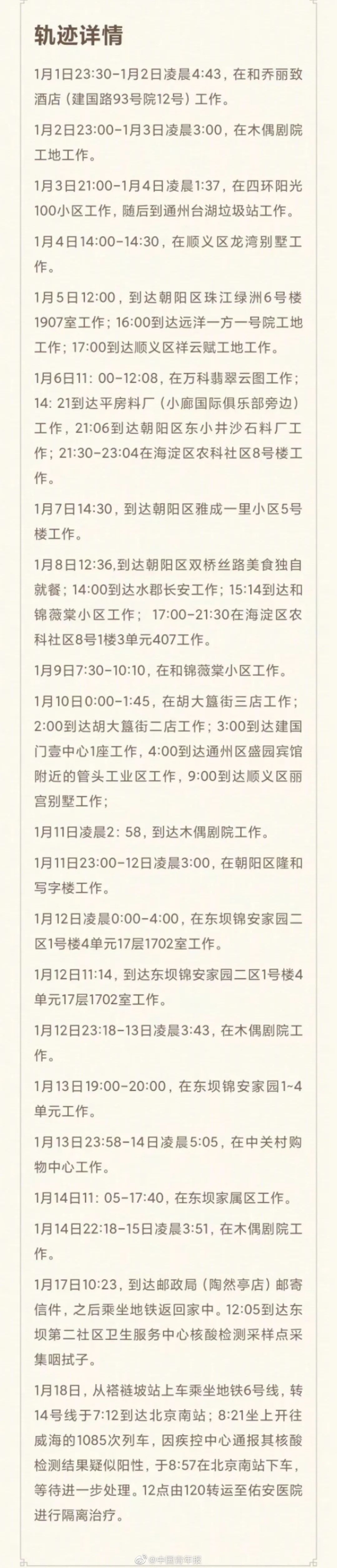 该人员居住在朝阳区平房乡石各庄村558号房,主要从事装修材料搬运工作,轨迹涉及至少23个地点,含胡大簋街两家店、中关村购物中心、木偶剧院等。