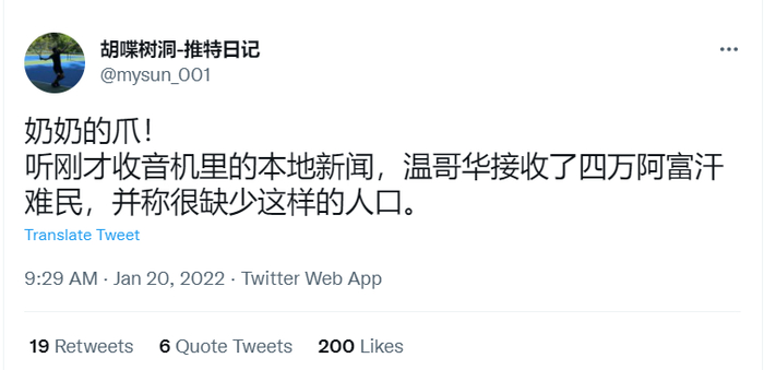 1月20日,有网友在推特上反映,自己在本地电台新闻中听到,温哥华接收了4万阿富汗难民,并称“很缺少这样的人口”。