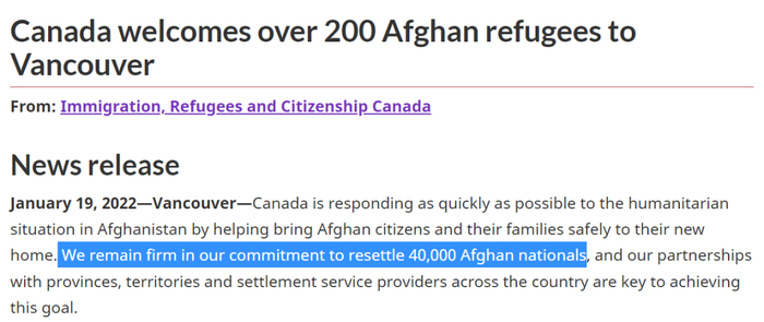 该文章显示,“超过200名阿富汗难民于昨晚(1月18日)在温哥华登陆。这是迄今为止搭载阿富汗公民飞抵不列颠哥伦比亚省的最大航班。其中大约161人将在温哥华开始他们的新生活,而另外48人将在他们有家庭关系的其他地方定居。这使得抵达加拿大的阿富汗难民总数超过7000人。”