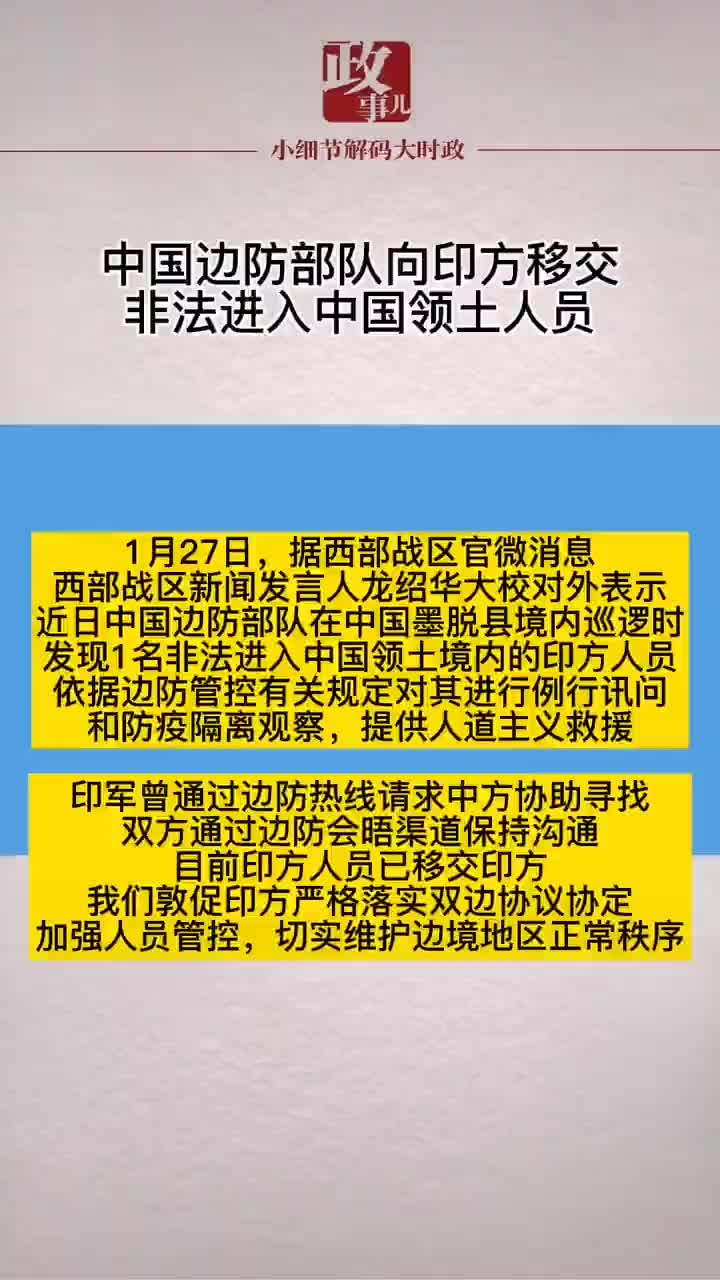 西部战区新闻发言人龙绍华大校对外表示,近日中国边防部队在中国墨脱县境内巡逻时,发现1名非法进入中国领土境内的印方人员,依据边防管控有关规定对其进行例行讯问和防疫隔离观察,提供人道主义救援。印军曾通过边防热线请求中方协助寻找,双方通过边防会晤渠道保持沟通,目前印方人员已移交印方。我们敦促印方严格落实双边协议协定,加强人员管控,切实维护边境地区正常秩序。