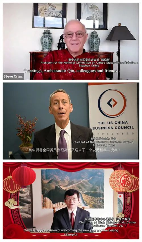 1月30日晚,驻美国使馆“虎虎生威庆新春、冰雪绽放迎冬奥”2022年虎年春节招待会在线上举行。秦刚大使发表致辞,美前总统卡特发来贺信,美中关系全国委员会会长欧伦斯、美中贸易全国委员会会长艾伦、盐湖城华助中心理事长乐桃文教授等嘉宾发表贺辞。