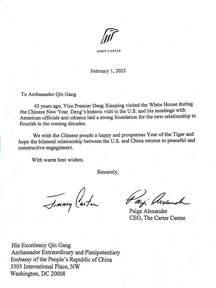美前总统卡特、卡特中心首席执行官佩吉在贺信中表示,43年前,邓小平副总理在春节期间访美。那次历史性访问以及他与美国官方、民间的互动,为未来几十年蓬勃发展的新中美关系奠定了坚实基础。我们祝愿中国人民虎年吉祥如意,希望中美关系在新的一年重回和平与建设性接触。