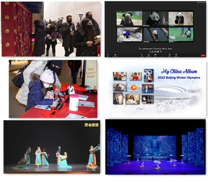秦刚大使和美方嘉宾致辞后,中国彩灯展和春节文化周、中美大熊猫过团圆年、《冬奥畅想》之《欢乐冰雪》等精彩节目相继上演,带观众身临其境感受肯尼迪艺术中心彩灯装点的浓浓新年氛围,见证华盛顿国家动物园美香、添添、小奇迹和四川大熊猫基地泰山、宝宝、贝贝一家六口的幸福生活和云上团圆,欣赏中国艺术家们的精彩杂技和冬奥冰雪项目表演。招待会前连续四天,驻美使馆还在社交媒体平台播出纪录片《新奋进》、中美青年新春云端联欢会、“迎新春、庆冬奥,大家一起嗨”全美侨界活动、“我的中国相册”北京冬奥会和中美体育人文交流视频集锦等精彩节目,掀起一波欢庆虎年春节、喜迎北京冬奥系列活动的高潮。