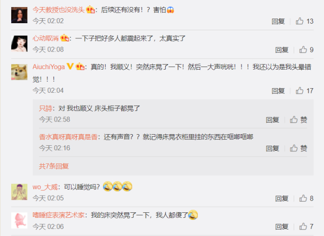 地震发生后,很多网友表示有震感。在国家地震台网官方微博@中国地震台网速报 发布的地震速报信息下,网友留言称“震感好明显,感觉整个楼都晃了一下,就像有巨人在外面拍了一下楼”,还有网友留言称,“坐标朝阳高碑店,马上睡着了,忽然一声轰隆后床就开始晃动”,还有在顺义区的网友也称,“真的!我顺义!突然床晃了一下!然后一大声咣咣!!!我还以为是我头晕错觉!!!”